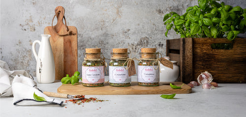 Unsere hochwertigen Gewürzmischungen enthalten nur das, was zählt: echte Kräuter und Gewürze. Kein Salz, keine Zusatzstoffe. Für bewusstes Würzen, ob zuhause oder als Mitbringsel. Gewürzmischungen ohne Salz aber mit 100% Liebe. Als Nachfüller oder im Korkenglas zum Verschenken.