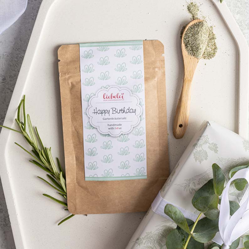 Happy Birthday! Dieses kleine Mitbringsel mit feinem Gartenkräutersalz bringt eine würzige Überraschung auf den Tisch. Ein liebevolles Geschenk für alle, die gerne kochen – ideal für Gemüse, Kartoffeln oder frische Salate.