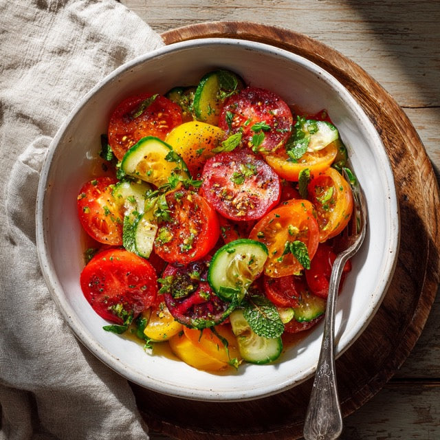 Frische Tomaten, knackige Gurke und ein mildes Dressing – mit der Gewürzmühle Salat & Gemüse wird dieser einfache Sommersalat zum aromatischen Highlight. Ideal für warme Tage.