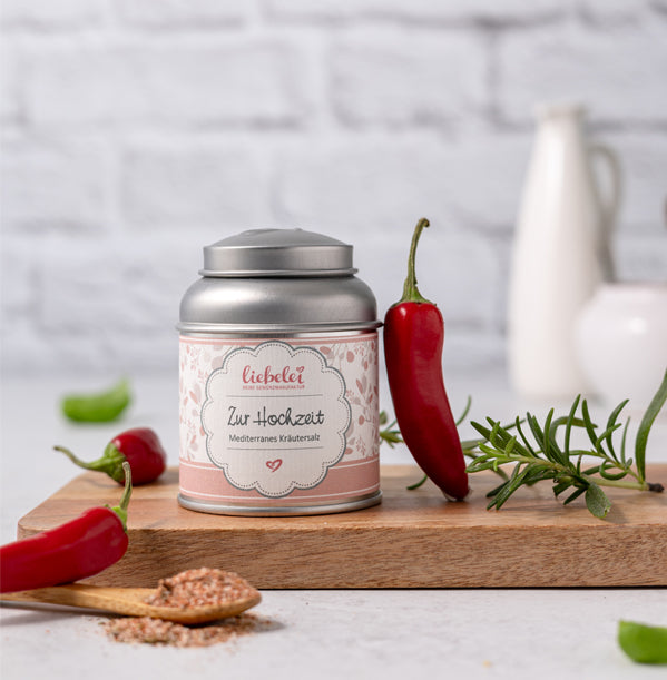 Ein kleines Geschenk mit großer Wirkung: Dieses mediterrane Kräutersalz mit einer feinen Chili-Note verleiht jedem Gericht eine Prise Liebe – ideal zum Verschenken zur Hochzeit.